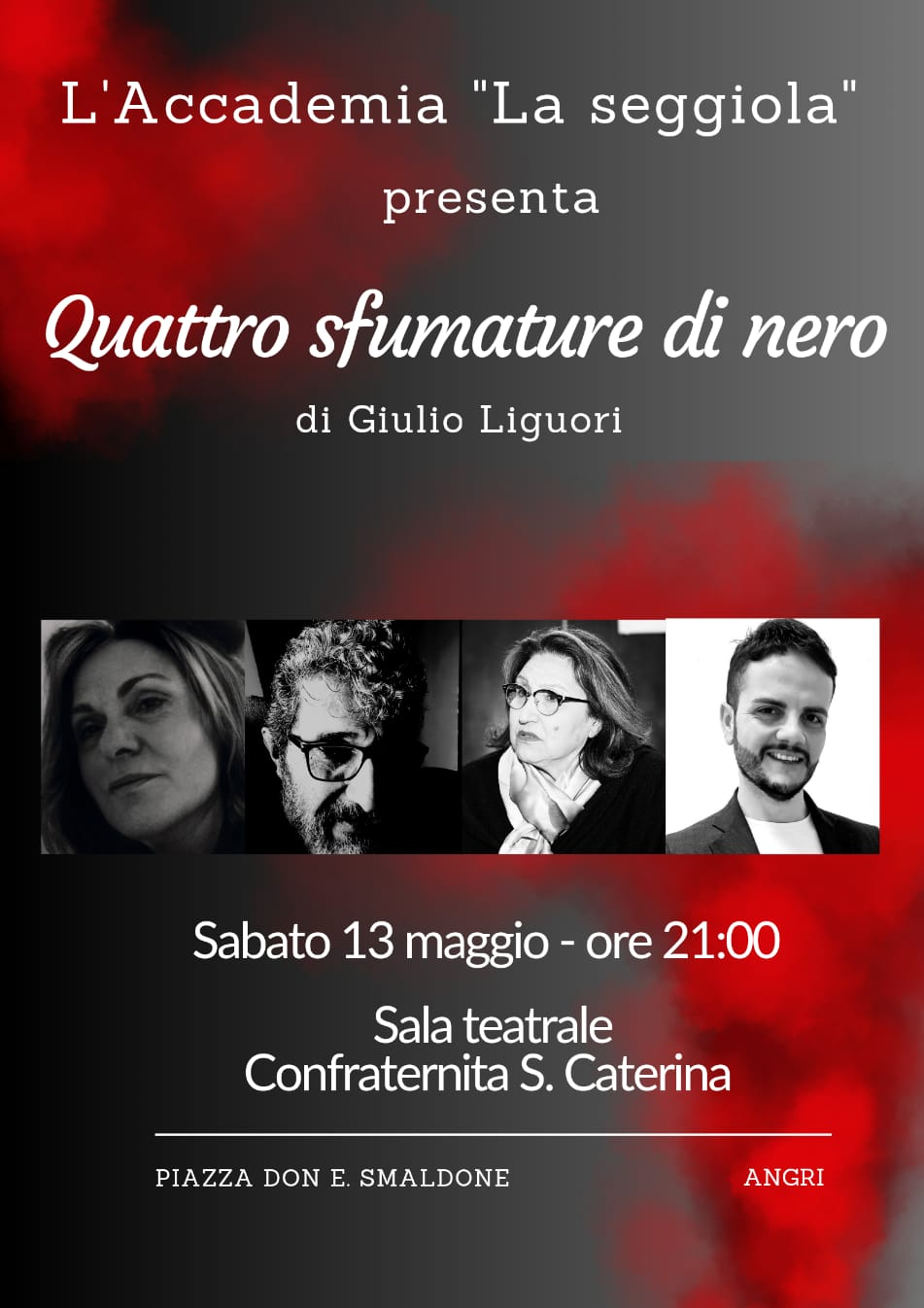 L’Accademia ” La seggiola ” continua la sua programmazione, con una nuova pièce, impegnativa e per questo entusiasmante: “Quattro sfumature di nero”, di Giulio Liguori, un viaggio nella parte più nascosta dell’animo umano, quella più intima ed oscura che, una volta rivelata, se può donare la libertà a chi si è abbandonato al suo potere, in tutti gli altri susciterà sentimenti contrastanti.