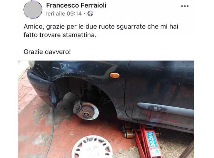 “Amico, grazie per le due ruote sguarrate che mi hai fatto trovare stamattina. Grazie davvero!” E subito sotto, apposita foto dell’auto e della ruota in procinto di essere cambiata.