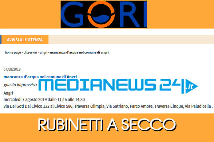 Gentile Utente, GORI comunica che a causa di un guasto improvviso sono in corso mancanze d’acqua e abbassamenti di pressione dalle 11:15 alle 14:30 di mercoledì 7 agosto 2019, nelle seguenti zone del comune di Angri: