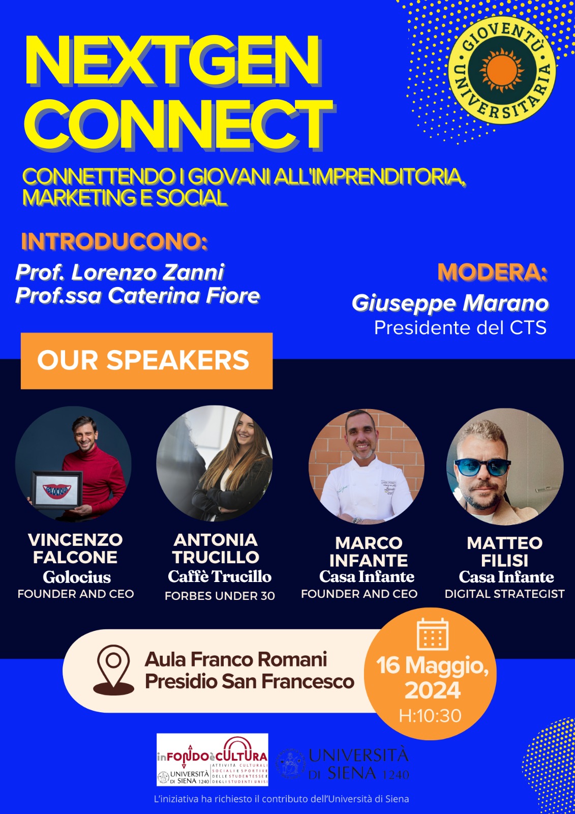 Oggi Antonia Trucillo, oltre a essere direttrice dell’accademia del Caffè, è un’assaggiatrice professionista e Q Grader, titolo che rappresenta la massima specializzazione nel mondo della formazione del caffè. Insieme ad Antonia Trucillo racconteranno la loro esperienza di successo anche Vincenzo Falcone, Founder di Golocious, e Marco Infante, Founder and Ceo di Casa Infante, altri due giovani imprenditori che stanno portando l’eccellenza campana alimentare ad alti livelli di notorietà. L’evento Nextgen Connect sarà ospitato nell’Aula “Franco Romani” del presidio San Francesco dell’Università di Siena, verrà introdotto da Lorenzo Zanni, Professore di Economia e Gestione delle Imprese e da Caterina Fiore, Professoressa della Scuola di Economia e Management dell’Università di Siena. Modererà Giuseppe Marano, Presidente del Consiglio Territoriale Studentesco.