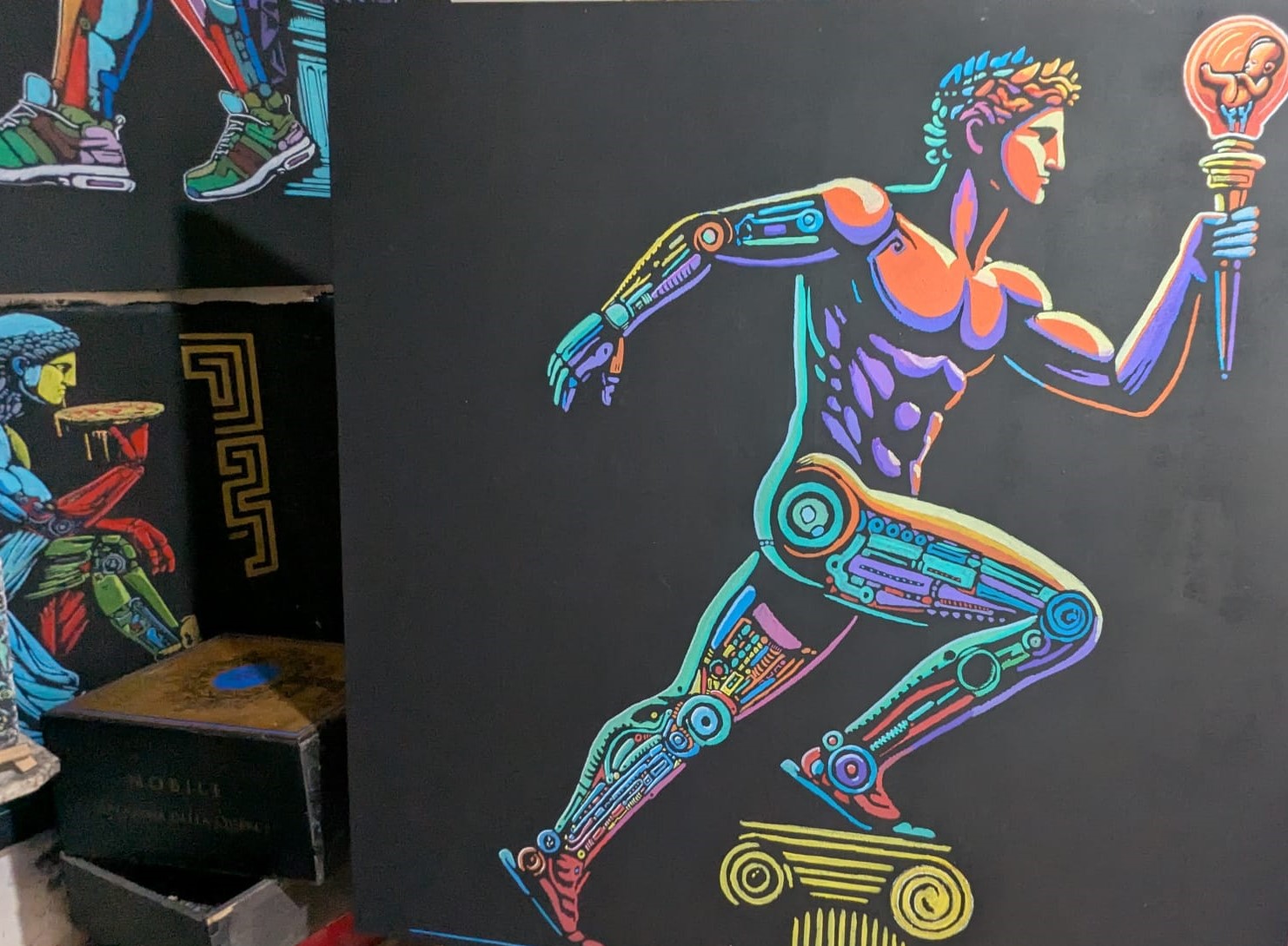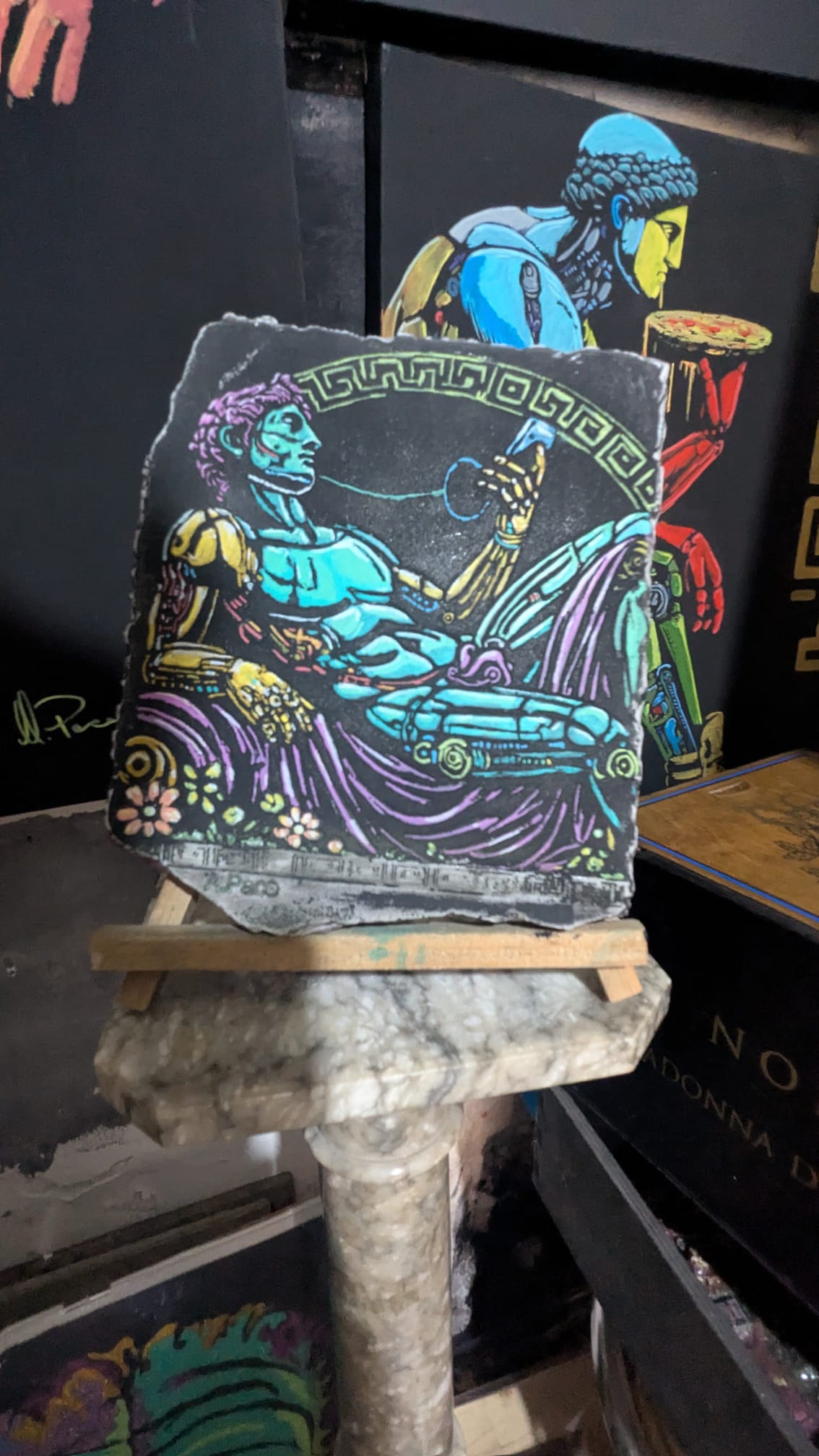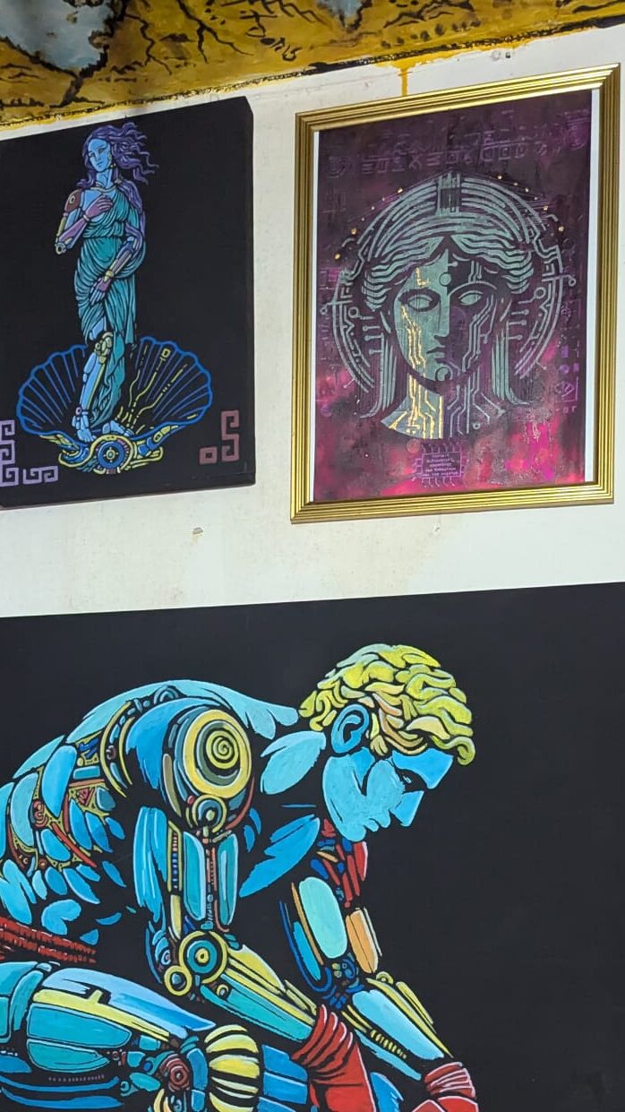 Entrare nello spazio di Pace è come varcare la soglia di un universo parallelo: un luogo in cui convivono resti del classicismo e visioni post-futuristiche. È un ambiente che ricorda i set dei film di fantascienza degli anni ‘70, epoca che ha fortemente influenzato l’immaginario dell’artista. In questo microcosmo di transavanguardia, il visitatore si imbatte in figure ibride, a metà tra uomo e macchina: cyborg dalle fattezze umane che imitano i gesti quotidiani: chi mangia, chi sente il bisogno di rinfrescarsi con un ventaglio, chi suona uno strumento, evocando emozioni con toccante realismo. Il tratto distintivo di Antonio Pace è proprio questo: ribaltare la narrazione comune del robot come entità fredda e antagonista dell’umanità. Nei suoi lavori, la macchina è erede dell’uomo, non suo nemico. È memoria vivente, testimone malinconico di un’umanità scomparsa che tenta di replicare, non per dominarla, ma per custodirne l’essenza. L’artista poliedrico nutre il continuo bisogno di sperimentare su supporti diversi la sua arte, per cui dipinge su oggetti di svariate fattezze per trovare la giusta consistenza tra la sua idea artistica e le forme robotiche.