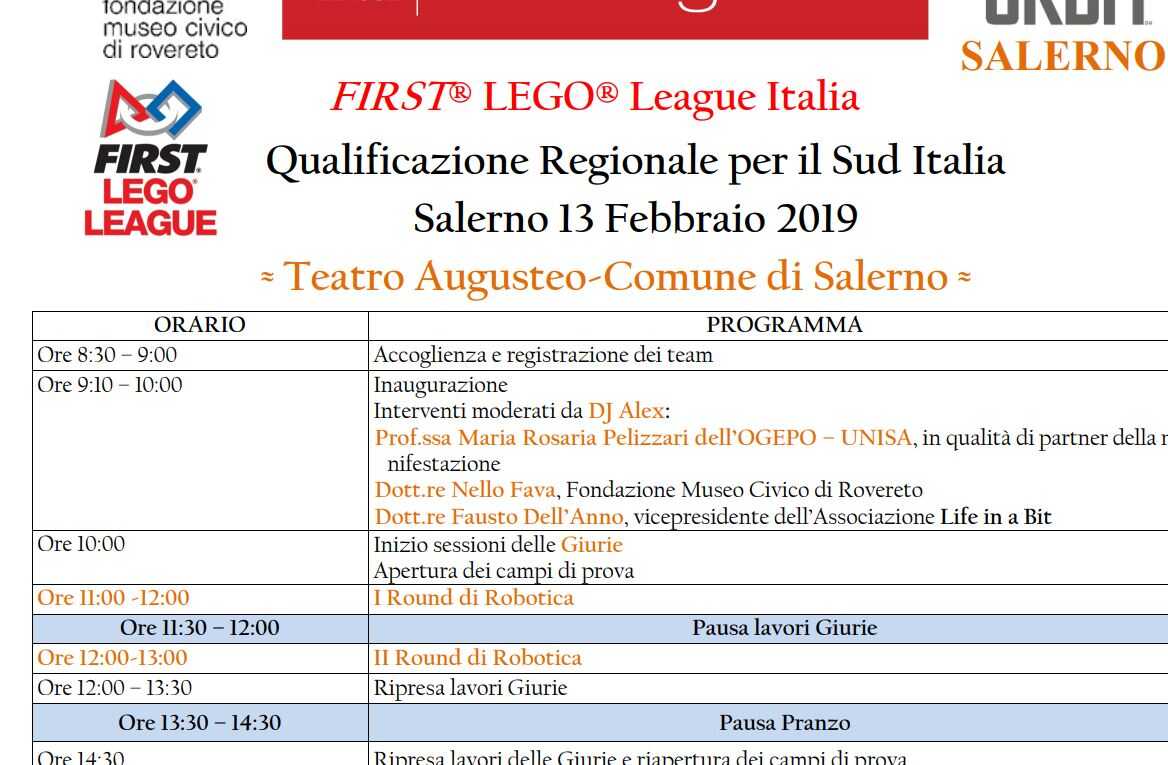 Si svolgeranno mercoledì 13 febbraio – con il patrocinio del Comune di Salerno e di OGEPO – le qualificazioni regionali per il Sud Italia riguardanti il concorso scientifico-robotico “FIRST® LEGO® League Italia 2018/2019”. La competizione tecnico-scientifica – perché di competizione si tratta – coordinata dall’Associazione Salernitana “Life in a Bit”- si svolgerà presso il Teatro Augusteo di Salerno, con inizio alle ore 8.30 e si concluderà alle ore 17. I vincitori della finale italiana, prevista a Rovereto nel marzo 2019 concorreranno alla finale mondiale negli USA.