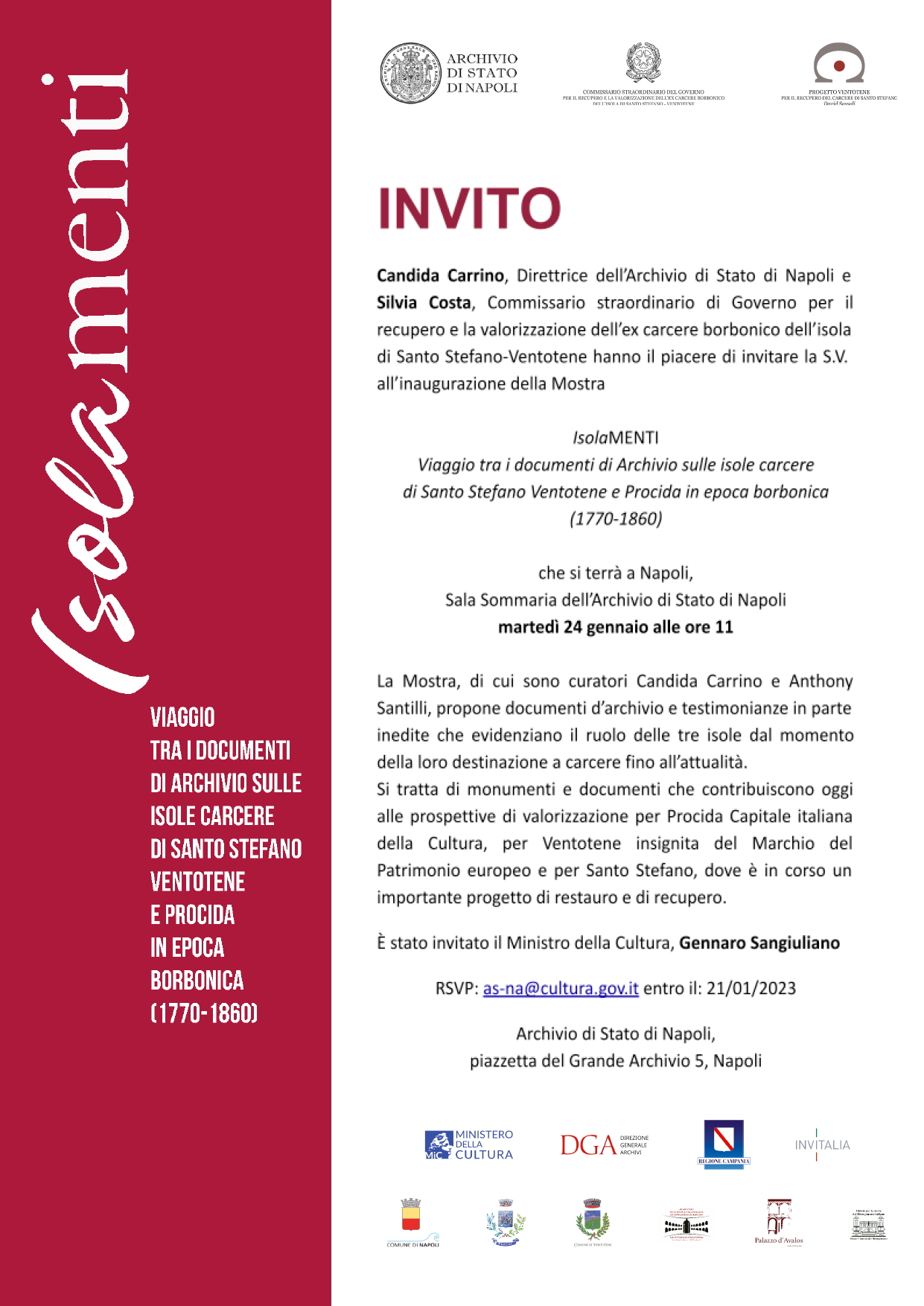 La mostra Isolamenti, è promossa dal Commissaria Straordinaria di Governo per il recupero dell’ex carcere borbonico di Santo Stefano/Ventotene e l’Archivio di Stato di Napoli e vede tra i co-promotori il Ministero della Cultura – DG Archivi, la Regione