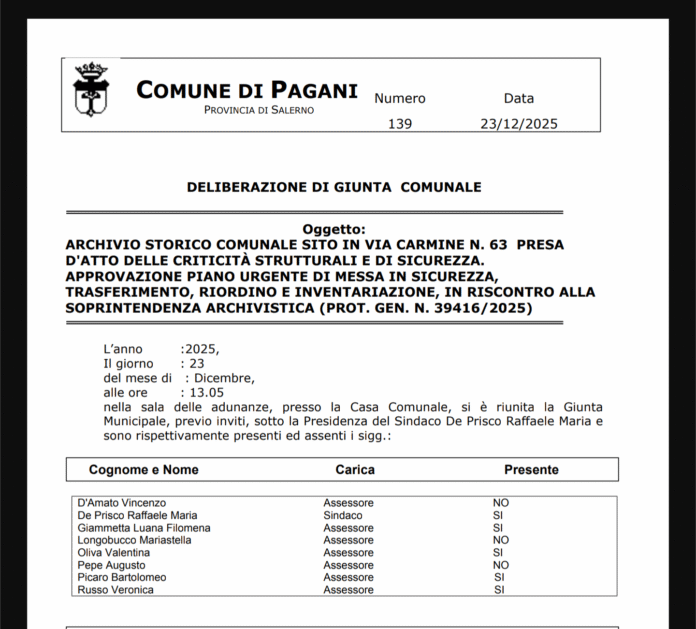 La domanda resta aperta: cosa rimane oggi della memoria storica di Pagani? Documenti rubati o dispersi, altri sopravvissuti in condizioni precarie. Una situazione che favorisce chi si improvvisa storico e costruisce narrazioni mitizzate del passato, e che fa comodo anche alla politica: una comunità senza memoria e senza identità è più facilmente disinteressata al proprio territorio.Solo ora, con la delibera di Giunta approvata il 23 dicembre 2025, l’amministrazione guidata dal sindaco Raffaele Maria De Prisco prende formalmente atto delle “gravi criticità strutturali e di sicurezza” dell’archivio storico comunale di via Carmine.