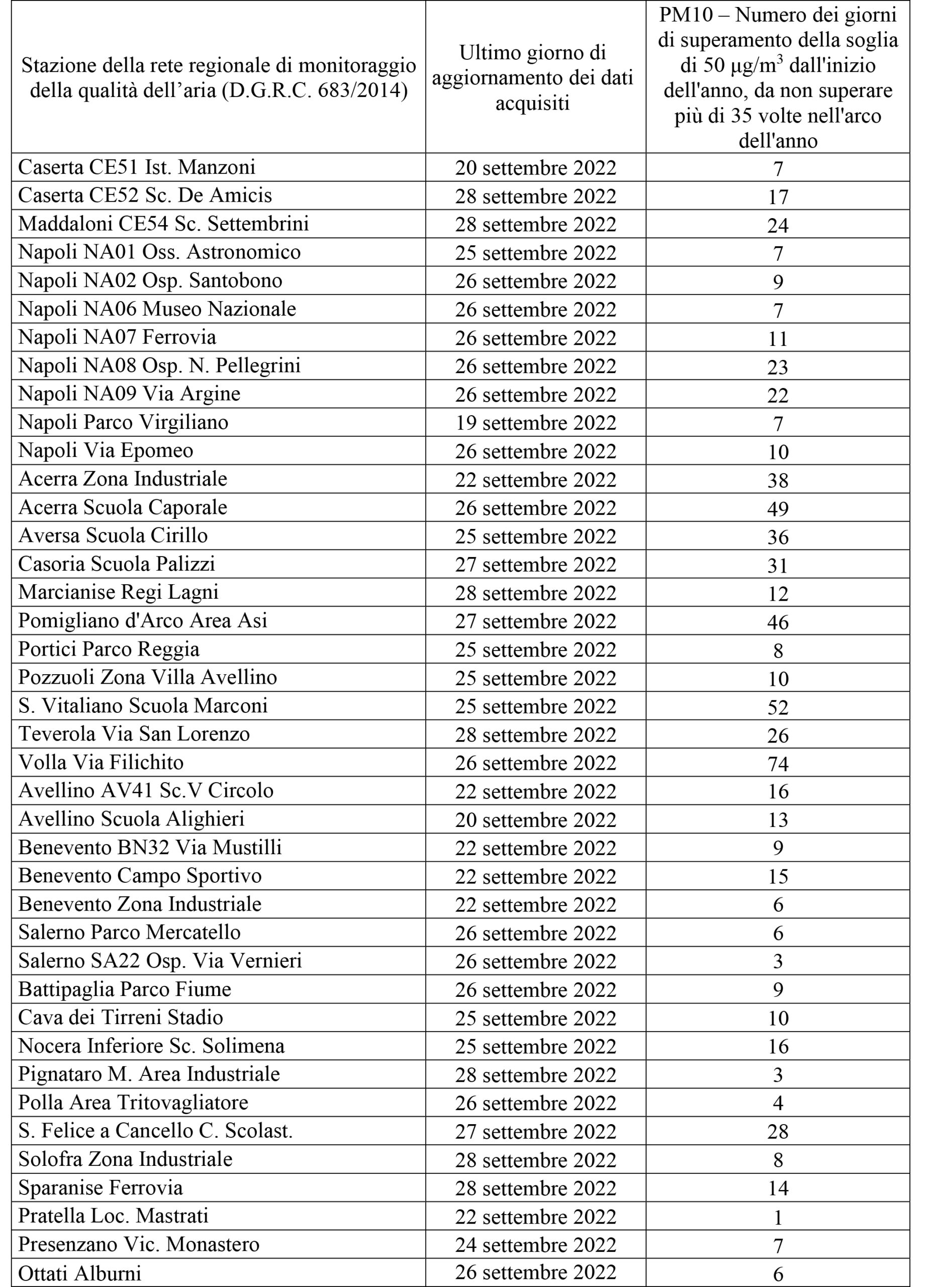 In particolare, per quanto riguarda il PM10, il prospetto del numero dei giorni di superamento (dall’inizio dell’anno) della soglia giornaliera di 50 μg/m3, che la legge stabilisce non sia superata più di 35 volte nel corso di un anno civile, in attesa delle successive fasi di validazione, si tratta di dati aggiornati, rispettivamente, al 25, 26,e 28 settembre 2022, è il seguente: