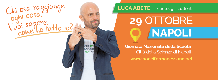 Fin dalla mattina alle 9.00, negli spazi di Città della Scienza, saranno aperti i desk nei quali lo staff del tour sarà a disposizione di studenti e insegnanti per fornire informazioni sul progetto, sul mondo del lavoro e dell’università e sulle aziende partner dell’iniziativa, che offrono non solo numerosi gadget, ma anche la possibilità di testare prodotti, lasciare curricula e usufruire di promozioni e vantaggi. Alle 12 in Sala Newton, davanti a una platea composta interamente da studenti, si terrà l’evento con Luca Abete: una originale e coinvolgente “lezione di ottimismo”. L’inviato di Striscia la notizia, partendo dalla sua esperienza personale, fornisce spunti per affrontare la vita in modo positivo e non arrendersi mai davanti alle difficoltà, rendendo ancora più concreto il grido e l’hashtag che caratterizzano il progetto #NonCiFermaNessuno”.