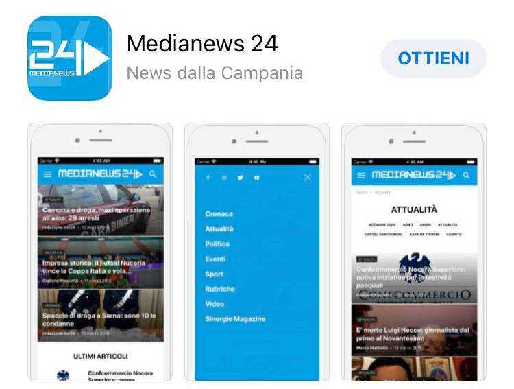Medianews24 innova e guarda al futuro, continuando a declinarsi sul digitale e arricchendosi di un nuovo prodotto: l’app ufficiale MN24, gratuita e disponibile per tutti gli smartphone. Le ultime notizie sportive, gli aggiornamenti degli eventi in tempo reale, le ultimissime di cronaca e di attualità, le rubriche e gli eventi live, tutto a portata di telefonino. Sulla nuova app di Medianews24 troverete anzitutto le notizie e i servizi più importanti che vedrete quando aprirete l’applicazione, in ordine cronologico, da quelli più recenti a quelli che vi siete persi. Navigando sulla nostra app potrete spostarvi da una sezione all’altra restando aggiornati in tempo reale sui principali fatti del giorno che accadono in Campania, e non solo. Una nuova personalizzabile esperienza di lettura delle notizie di cui non potrete più fare a meno!
