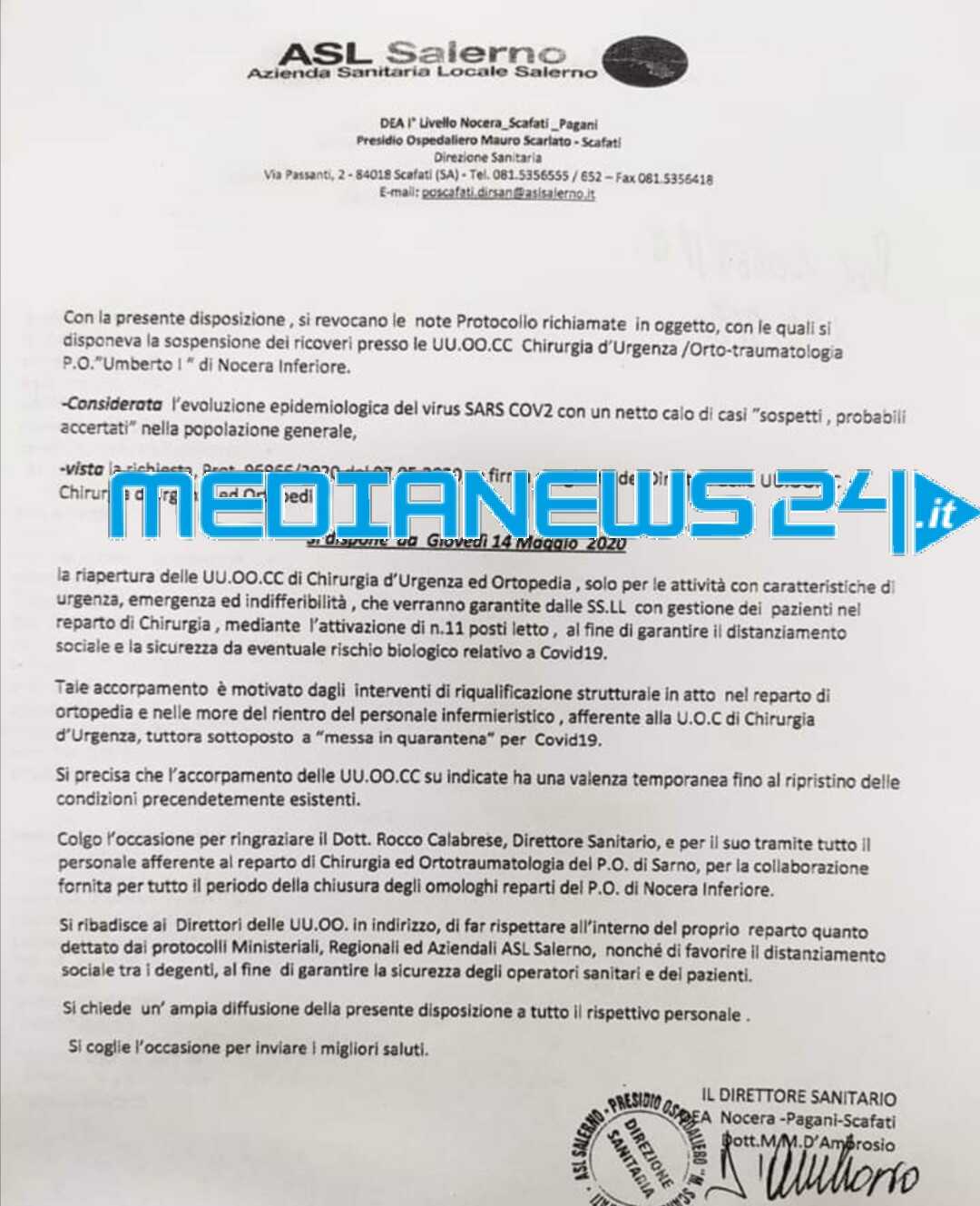 ASL Salerno – DEA – riapertura delle UU.OO.CC di Ortopedia e Chirurgia d’urgenza