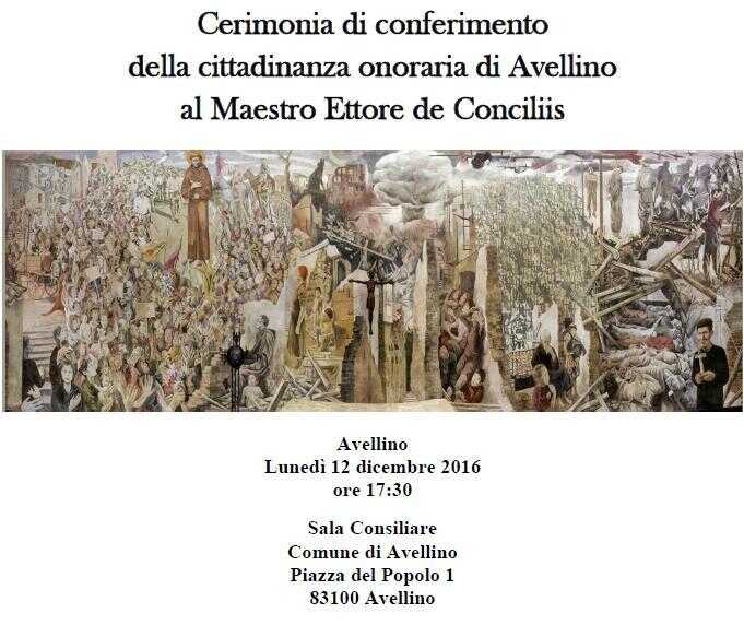Avellino conferisce la cittadinanza onoraria al concittadino Ettore de Conciliis, pittore e scultore italiano. La cerimonia si terrà lunedì 12 dicembre 2016, alle ore 17.30 nella Sala Consiliare del Comune di Avellino. Dal 2005 la Comunità Europea e il Comune di Fiano Romano promuovono la realizzazione di uno Studio-Museo nella chiesa medievale Santa Maria ad Pontem, dove vengono raccolte le opere del maestro nato ad Avellino, ma attualmente residente a Fiano Romano.