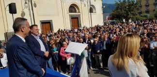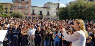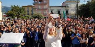 Ma è la giornata di Cristoforo Salvati e dell’investitura ufficiale ricevuta da Giorgia Meloni che quando sale sul palco parla subito alla folla sottolineando l’importanza del ballottaggio: “Cristoforo Salvati è la persona giusta per Scafati, l’uomo che può guidare la città con lealtà, impegno e coerenza. Non è un caso se è stato scelto per rappresentare il partito in questa città e non è neanche un caso il fatto che tutti i sindaci di Fratelli d’Italia siano stati riconfermati. Per questo dico date fiducia a Salvati che sarà il vostro sindaco per i prossimi 10 anni, perché la prossima volta sarà ancora più facile votarlo per il programma che intende attuare”. L’applauso di Piazza Vittorio Veneto è scrosciante, non ci sono soltanto i fedelissimi, ma oltre a tutti i consiglieri si nota la presenza massiccia di cittadini davvero interessati alle parole della Meloni e a quelle di Cristoforo Salvati che ribadisce: “Scafati deve uscire dalle vecchie dinamiche della politica. Voglio essere il sindaco di Scafati che porterà avanti il dialogo e la volontà di ricompattare tutto il centrodestra cittadino”. Cristoforo Salvati mette in campo una trasparenza inoppugnabile: “Scafati non può andare in mano alla sinistra, dobbiamo creare un centrodestra compatto che sappia far risorgere la città senza personalismi”. Al fianco della Meloni e di Salvati anche il senatore Antonio Iannone e il deputato Edmondo Cirielli, i quali confermano la vicinanza del partito a un uomo come Cristoforo Salvati sempre coerente con le sue idee, all’interno di un centrodestra che ha bisogno di persone che sappiano spingerlo sempre più in alto. Cirielli parla delle scelte effettuate in questi anni e dell’importanza che adesso ha un partito come Fratelli d’Italia che ha ottenuto la fiducia degli elettori e che può portare ben quattro consiglieri nell’assise scafatese, con Alfonso Di Massa, Alessandro Arpaia, Mario Santocchio e Anna Conte pronti a rappresentare un partito che grazie alle amministrative è oggi il più forte nello scenario politico scafatese. Il senatore Iannone apre il comizio e lo fa con l’appoggio incondizionato a Salvati: “Scafati deve scegliere la persona giusta per ricominciare il suo percorso e se siamo qui è perché crediamo in Cristoforo Salvati”.
