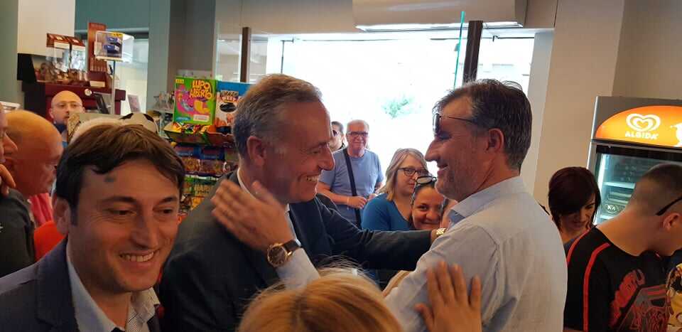 L’abbraccio forte e sincero di Marco Cucurachi a Cristoforo Salvati è una delle immagini più rappresentative di queste ultime ore della campagna elettorale del candidato sindaco di centrodestra. Nell’aperitivo organizzato al bar Di Lallo in via Dante Alighieri, il candidato sindaco trova l’avvocato ad attenderlo e ad abbracciarlo, pubblicamente. Tutte le persone presenti, un centinaio, fanno scattare un lungo applauso.