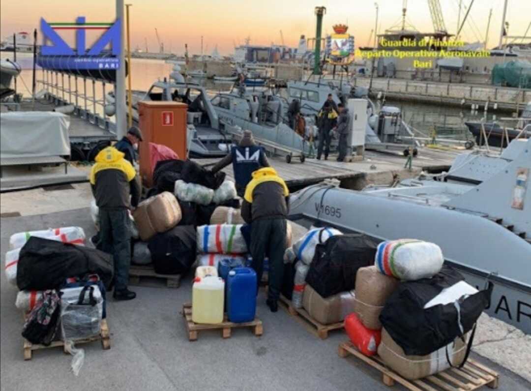 Quasi una tonnellata di stupefacenti, hashish e marijuana, è stata sequestrata durante un’operazione condotta dalla DIA e dal Reparto Operativo Aeronavale della Guardia di Finanza di Bari, che ha anche arrestato due italiani che, alla guida di due imbarcazioni, stavano importando la droga dai Balcani. Le imbarcazioni, che viaggiavano di notte a velocità sostenuta, sono state segnalate come sospette nell’ambito di una missione di controllo delle frontiere esterne dell’Unione Europea. Le unità navali del R.O.AN. di Bari sono immediatamente intervenute riuscendo a intercettare al largo di Monopoli (Bari) due semicabinati di 7 metri, ciascuno dotato di un potente motore fuoribordo. Al termine dell’operazione sono stati sequestrati circa 900 chilogrammi di droga (di cui 646 chili di marijuana e 250 di hashish) che avrebbe reso all’organizzazione criminale circa 10 milioni di euro. Il carico era suddiviso in 54 involucri, ripartiti ognuno in confezioni da 2, 5 e 10 chilogrammi, contrassegnati da sigle di diverso colore a seconda delle zone di produzione, del tipo di sostanza stupefacente, nonché dei destinatari in Italia.