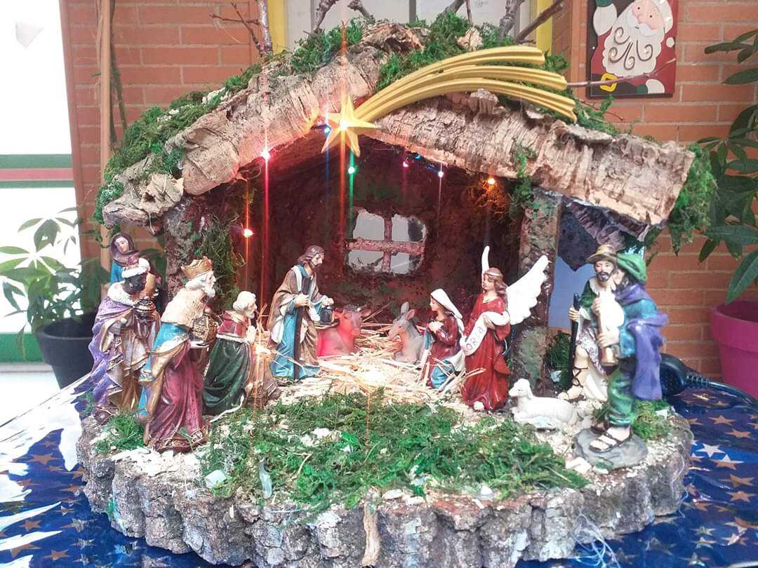 Il bellissimo presepe realizzato dagli studenti della scuola San Francesco di Baronissi, in un tronco d’albero con cartapesta e giornali riciclati, e luci a led colorate.