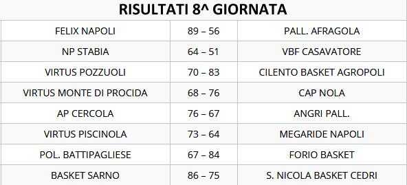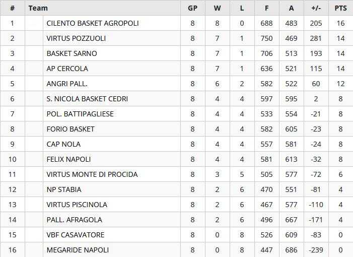 Con la vittoria (86-75) su S.Nicola, il Basket Sarno aggancia Pozzuoli al secondo posto della graduatoria nella prima fase del campionato Serie C Silver: sarrastri a quota 14 insieme ai puteolani e alla Pallacanestro Cercola, staccate di 2 sole lunghezze dalla capolista Cilento Basket Agropoli.