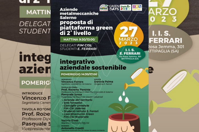 La tavola rotonda pomeridiana, dalle 14.30 alle 17, sarà introdotta dal segretario generale della Fim Cisl Salerno, Vincenzo Ferrara, con i saluti della dirigente scolastica, Daniela Palma, prenderanno parte il professore Roberto Parente del dipartimento Disa-Mis dell’Università degli Studi di Salerno, Pasquale Sessa, vicepresidente nazionale dei Giovani industriali, le aziende metalmeccaniche del territorio, gli Enti formativi, il consiglio generale della Fim Cisl Salerno, gli studenti dell’istituto Ferrari ed il coordinamento green della Fim Cisl nazionale guidato dal segretario nazionale, Valerio D’Alò. Modererà il tutto Antonello Gisotti della Fim Cisl Nazionale che nei mesi scorsi ha provveduto anche alla realizzazione di 7 Rooms di 45 minuti, ovvero pillole formative indirizzate ai delegati sindacali della Fim Cisl di Salerno. Insomma, un’intensa giornata di contaminazione generazionale con obiettivi di sviluppo sostenibile per i lavoratori del futuro.