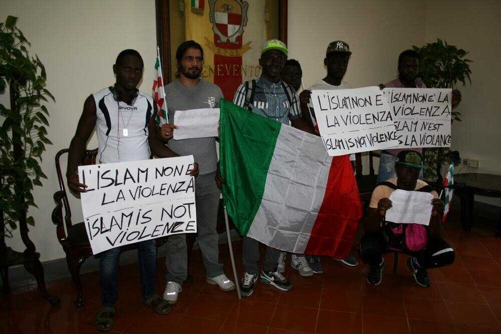 Il vice sindaco di Benevento, Erminia Mazzoni, ha ricevuto ieri a Palazzo Mosti una delegazione di migranti attualmente ospitati in strutture sannite che ha voluto esprimere la propria solidarietà al popolo italiano per le vittime della strage di Dacca e soprattutto ha voluto dissociarsi dal terrorismo islamico, esponendo anche dei cartelloni recanti la scritta: “L’Islam non è violenza”.