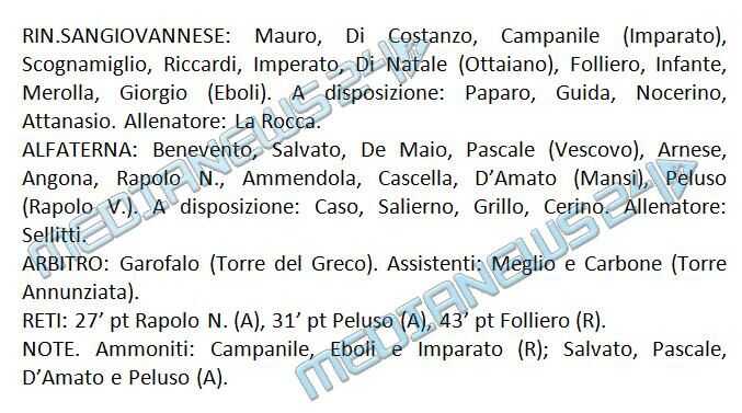 Importante successo in chiave play-off per l’Alfaterna, che riscatta la prova incolore di sabato scorso contro il Mons Prochtya e batte a domicilio la Rinascita Sangiovannese. L’undici di mister Sellitti, privo di capitan Franza, approccia nel migliore dei modi alla partita e, dopo una conclusione di Cascella intorno al 15’, piazza un micidiale uno-due a cavallo della mezz’ora.