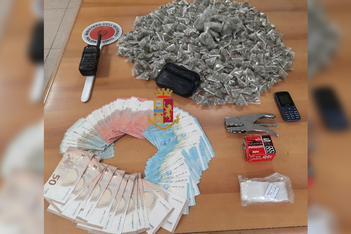 I poliziotti hanno controllato l’abitazione dell’uomo ed hanno trovato una donna che, al loro arrivo, ha lanciato dal balcone una borsa con un telefono cellullare, del materiale per il confezionamento della droga e 389 bustine di marijuana; inoltre, hanno rinvenuto, occultate in un cassetto, altre 6 confezioni della stessa sostanza per un peso complessivo di 510 grammi ed hanno sequestrato 2.125 euro.