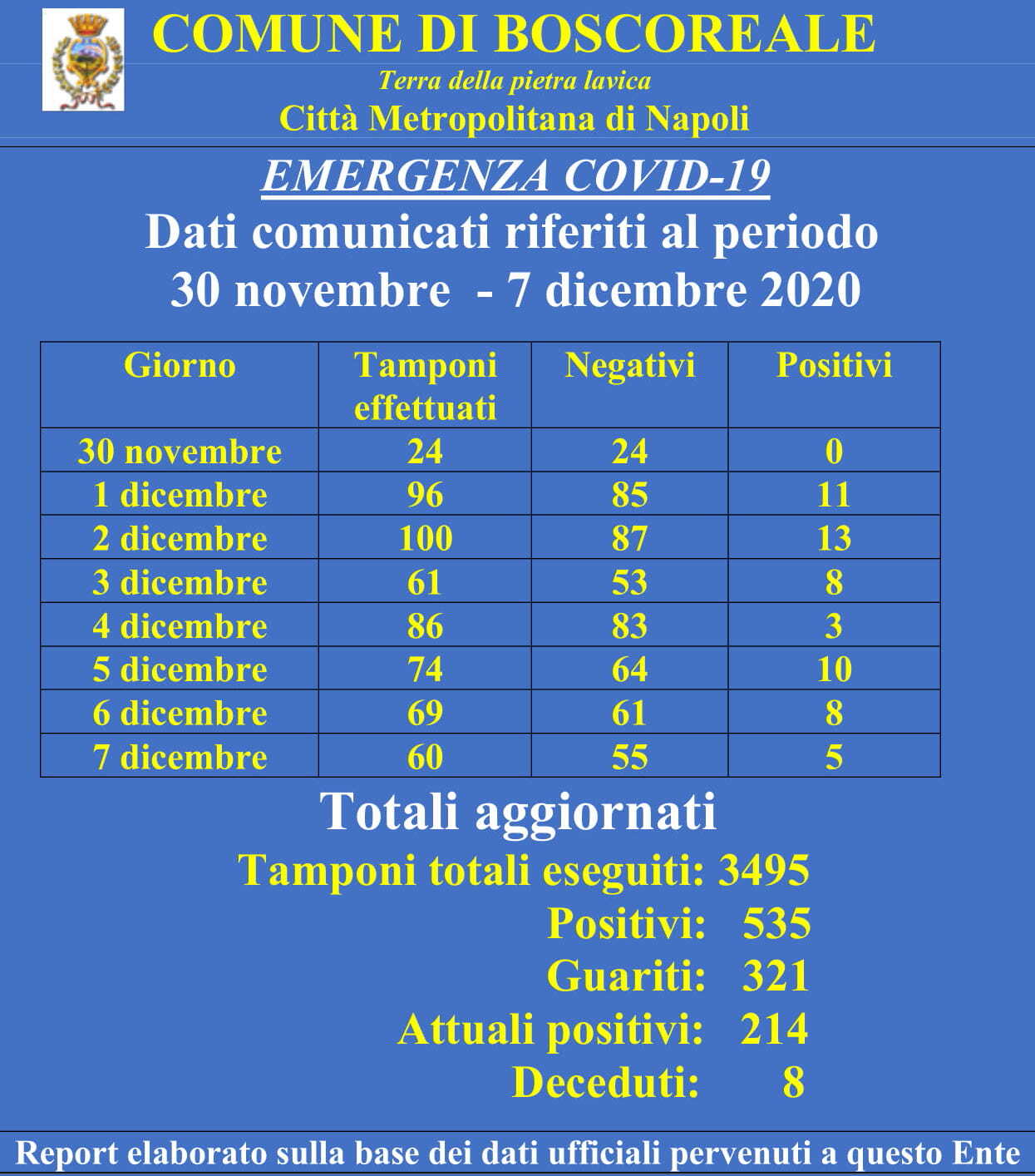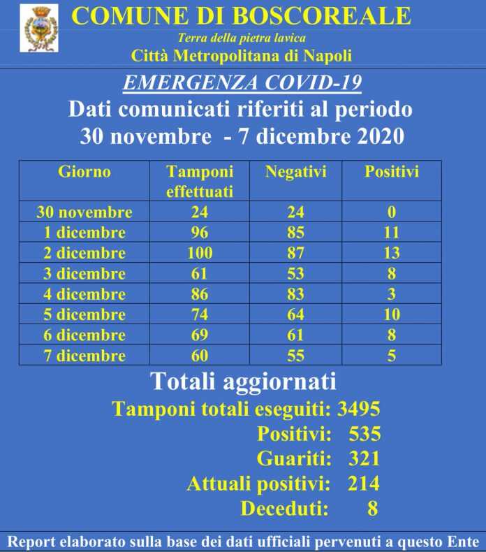“Come anticipato nei giorni scorsi, abbiamo provveduto ad allineare gli ultimi dati pervenuti al nostro Ente, a partire da metà ottobre, da parte sia dell’ASL sia della Regione Campania. La situazione attuale si conferma in miglioramento con un buon numero di guariti pari a 321, su 535 cittadini risultati positivi. I tamponi effettuati in questo stesso periodo sono stati 3495”. A comunicarlo il sindaco Antonio Diplomatico, che aggiunge: “Ci sono stati altresì comunicati 8 decessi a causa del Covid, ed è alle loro famiglie che rivolgiamo le condoglianze da parte di tutta l’Amministrazione. Per tale motivo invito tutti i cittadini, la cui stragrande maggioranza si è comportata egregiamente, a mantenere ancora alta l’attenzione per contribuire a limitare il contagio”.