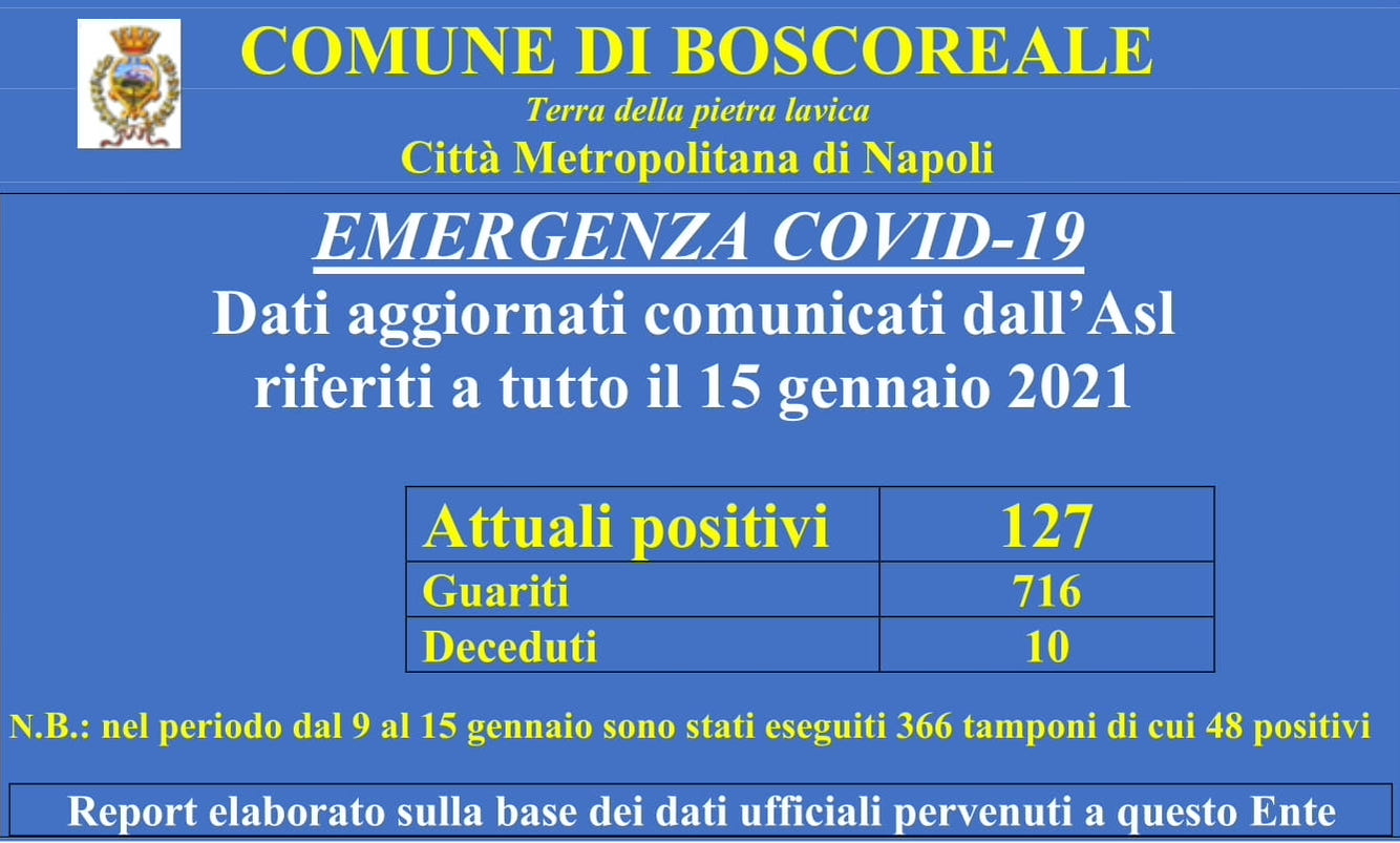 Dopo 10 giorni di silenzio, arrivano le ultime notizie sui casi di positività in città. Il gran numero di negativizzati fa ben sperare, in dieci giorni da 529 guariti si è passati a 716. I dati sono incoraggianti, anche se nell’ultimo report del 7 gennaio i casi di positività erano 124 e ad oggi sono 127. Dal 9 al 15 gennaio sono stati effettuati 366 tamponi dei quali solo 48 positivi.