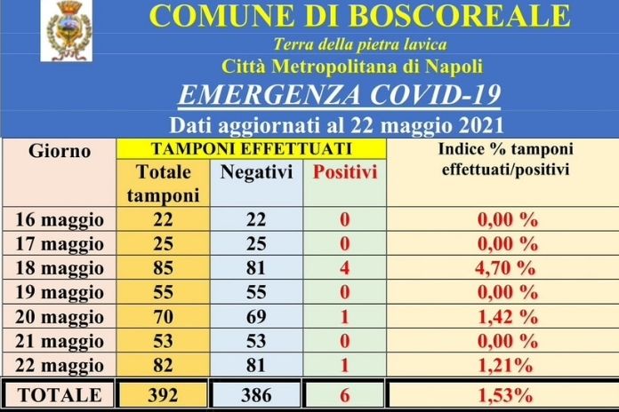 In questi ultimi sette giorni sono stati eseguiti complessivamente 392 tamponi, di cui 386 negativi e solo 6 positivi, facendo attestare all’1,53% il tasso medio percentuale tra tamponi effettuati e positivi riscontrati.