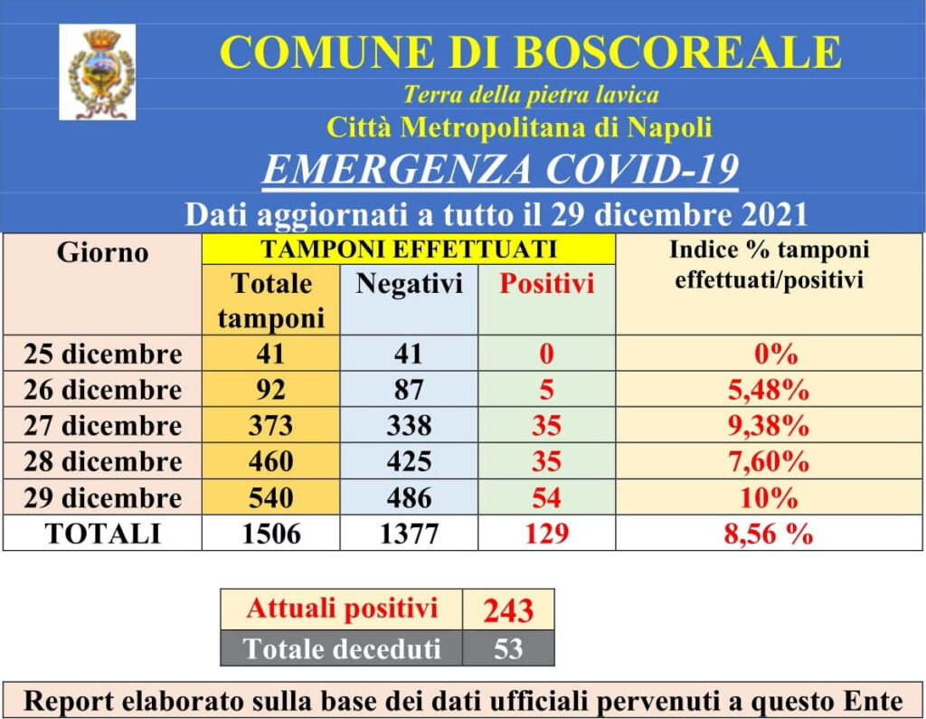 Anche nella nostra città continua inarrestabile l’aumento dei contagi da Covid-19. In soli cinque giorni, dal 25 al 29 dicembre, gli attuali positivi sono passati a 243, quasi raddoppiati rispetto alla precedente rilevazione (al 24 dicembre erano 124).