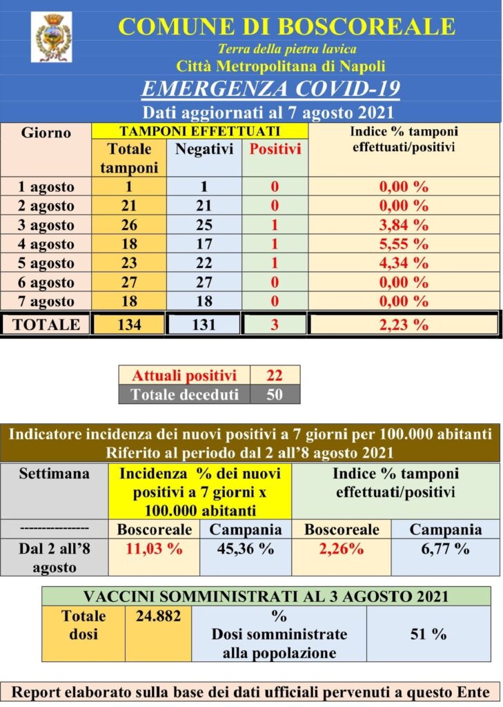 Come si rileva dall’allegato report, dall’1 al 7 agosto in città si sono registrati 3 casi di positività al Covid-19, su un totale di 134 tamponi effettuati, con una percentuale del 2,23 % dell’indice tamponi effettuati/positivi riscontrati.