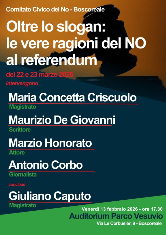 Nasce a Boscoreale il Comitato civico per il No al referendum del 22 e 23 marzo 2026, composto da associazioni e cittadini del territorio vesuviano. Primo evento pubblico voluto dal Comitato è in programma venerdì 13 febbraio alle ore 17.30 presso l’Auditorium Parco Vesuvio, in via Le Corbusier 9 a Boscoreale.