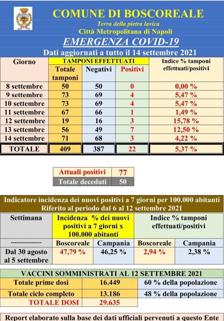 Fino al 12 settembre a cittadini boschesi sono state somministrate complessivamente 16.022 prime dosi di vaccino (59% della popolazione), mentre 12.769 cittadini (47% della popolazione) hanno completato il ciclo vaccinale con doppia dose.