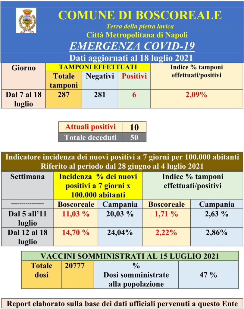 Boscoreale. “Report dati Covid” aggiornato al 18 luglio