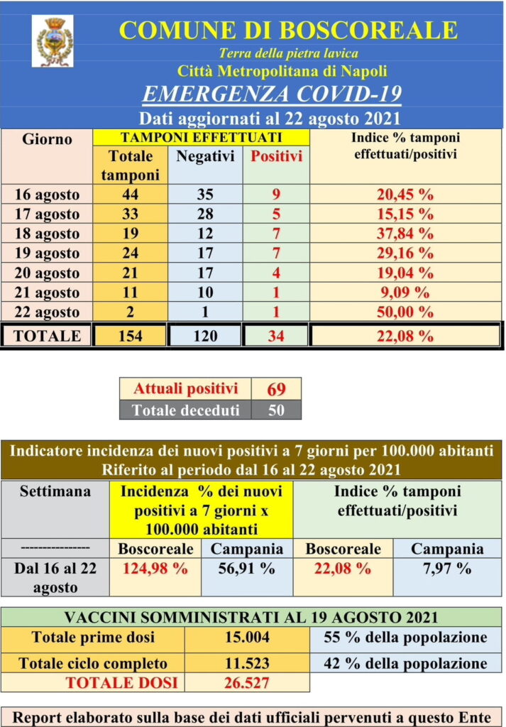 Fino al 19 agosto a cittadini boschesi sono state somministrate complessivamente 15.004 prime dosi di vaccino (55% della popolazione), mentre 11.523 cittadini (42% della popolazione) hanno completato il ciclo vaccinale con doppia dose.