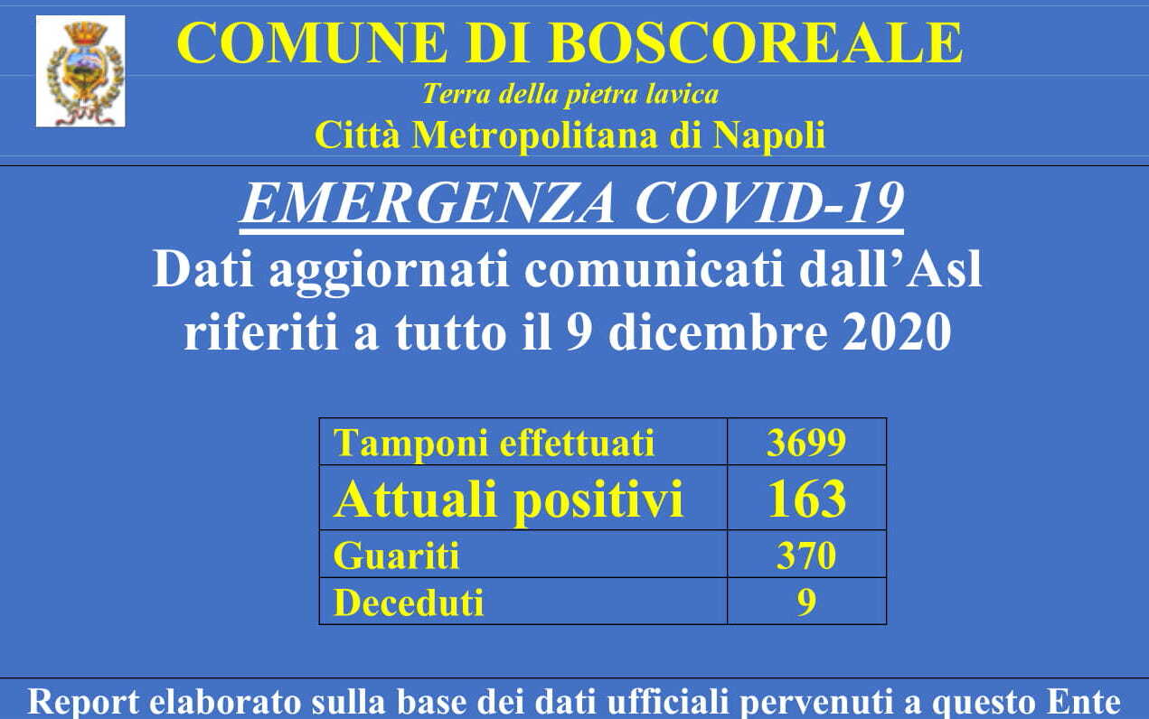 Secondo l’ultimo report ci sono altri 49 guariti per un totale di 370 portando così il numero dei positivi attuali a 163. Un calo considerevole che purtroppo si accompagna alla notizia di un altro decesso. Sono 9 i cittadini boschesi deceduti per Covid.