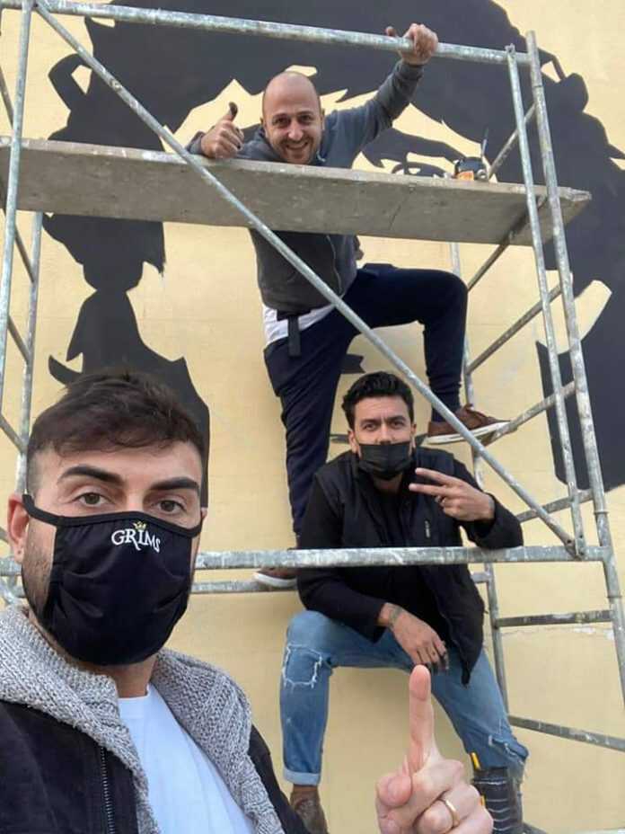 Con l’utilizzo della sola vernice nera lo sguardo di Diego Armando Maradona accoglierà e accompagnerà i clienti del Grims durante le loro soste.