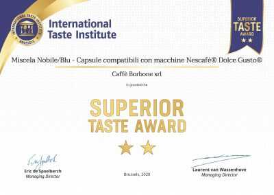 Anche la Miscela Nobile Blu – capsule compatibili con macchine Nescafè® Dolce Gusto® di Caffè Borbone si aggiunge alla lista dei prodotti meritevoli di encomio secondo la giuria internazionale composta dai migliori Chef e Sommelier del mondo dell’International Taste Institute, leader mondiale nella valutazione e certificazione di alimenti e bevande di consumo. Il Superior Taste Award è uno dei riconoscimenti più rinomati al mondo perché valuta il GUSTO, in maniera obiettiva e indipendente, senza che la marca influenzi i giurati. La valutazione non dipende dal gusto personale dei giudici ma da una stima della qualità organolettica dei prodotti secondo un approccio sistematico basato sul metodo di analisi sensoriale edonica internazionale.