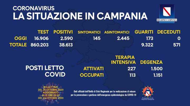 I Positivi del giorno sono 2.590 di cui 2.445 asintomatici e 145 sintomatici su un totale di 16.906 tamponi effettuati.