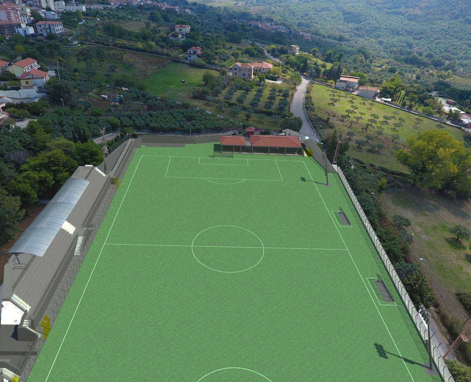Nello specifico si dovranno eseguire: sottofondo del sistema manto, sistema manto in erba sintetica, smaltimento acque meteoriche, canaletta prefabbricata in cls, tubazione drenante flessibile corrugata esternamente, impianto irrigazione, impianto elettrico e recinzione. Inoltre prevista la realizzazione di una scala e una rampa disabili per il raggiungimento delle tribune ospiti dal lato ovest del campo, la realizzazione di un piccolo manufatto servizi adibito a bagni e biglietteria posto tra la fine della rampa disabili e la tribuna tifosi ospiti, la demolizione e la ricostruzione di un piccolo manufatto adibito a spogliatoio arbitri e locali tecnologici posto a sud est del campo sportivo.
