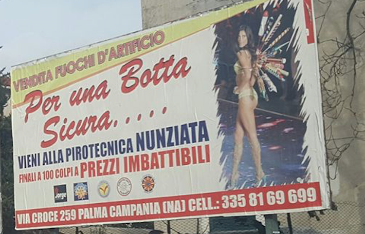 Sta diventando virale in queste ore la foto del cartellone pubblicitario di una ditta di fuochi d’artificio presente a Palma Campania. La Pirotecnica Nunziata, infatti, da qualche giorno sta divertendo tutti con lo slogan pubblicitario “Per una botta sicura…vieni alla pirotecnica Nunziata”.