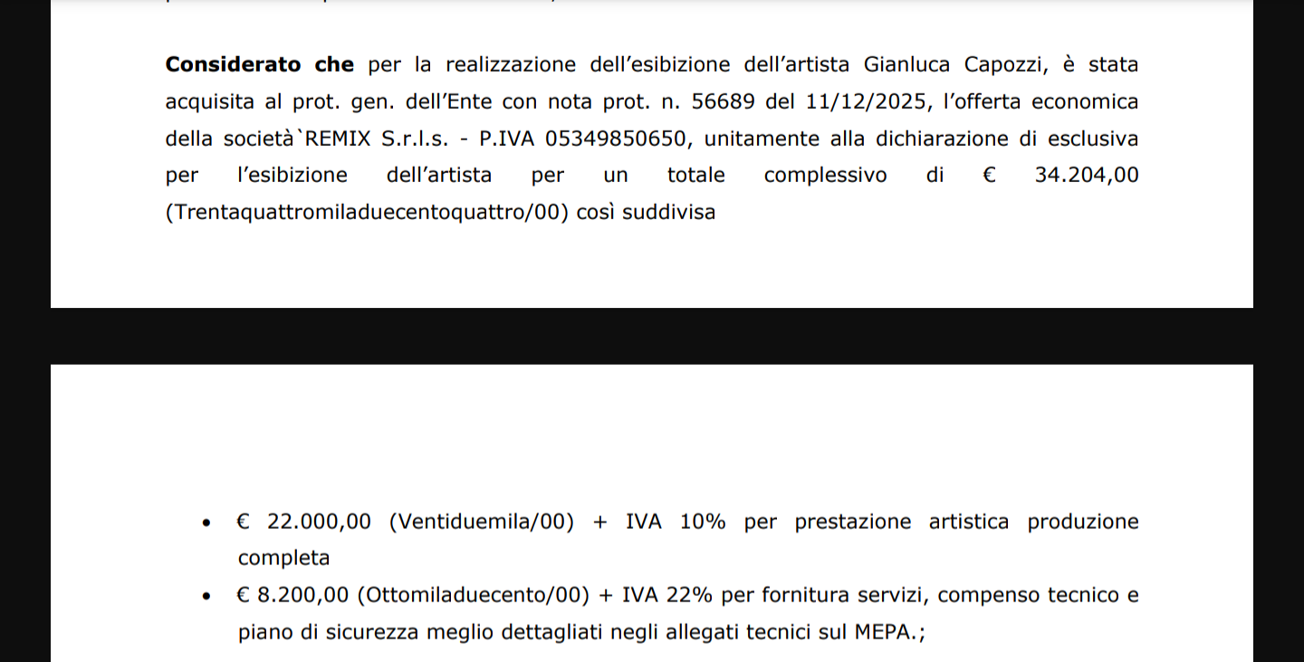 In quel caso, la determina specificava con precisione cosa fosse incluso nel servizio: viaggi, vitto e alloggi per artista, musicisti e staff; fornitura di impianto audio e luci con personale tecnico qualificato; trasporto materiale tecnico logistico; piano di sicurezza (PSC); allestimento palco 12×10 con scala di accesso; gruppo elettrogeno con operatore; transenne antipanico per il fronte palco e transenne modello Ceta per chiusura area palco e backstage; ambulanza con personale medico.Nel caso del concerto di Capozzi, le voci di spesa fa riferimento alla fornitura servizi, compenso tecnico e