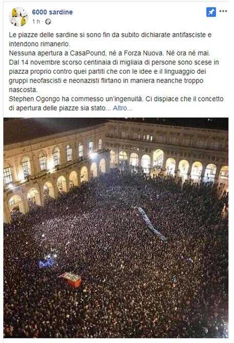 ”Le sardine ci invitano in piazza? Ci andiamo, ma non canteremo di certo Bella Ciao”, risponde così, su twitter, il leader di Casapound Simone Di Stefano a Stephen Ogongo considerato leader delle Sardine di Roma che, in un’intervista al Fatto, ha aperto piazza San Giovanni anche all’estrema destra (‘Per me chiunque vuol scendere in piazza è il benvenuto’). A Di Stefano replica il movimento su Facebook: ‘Le piazze delle sardine si sono fin da subito dichiarate antifasciste e intendono rimanerlo. Nessuna apertura a CasaPound, né a Forza Nuova. Né ora né mai’.