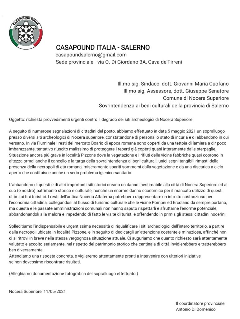 Diretta e chiara, la richiesta del coordinatore provinciale di CasaPound Italia- Salerno, Antonio Di Domenico, al Sindaco Giovanni Maria Cuofano.