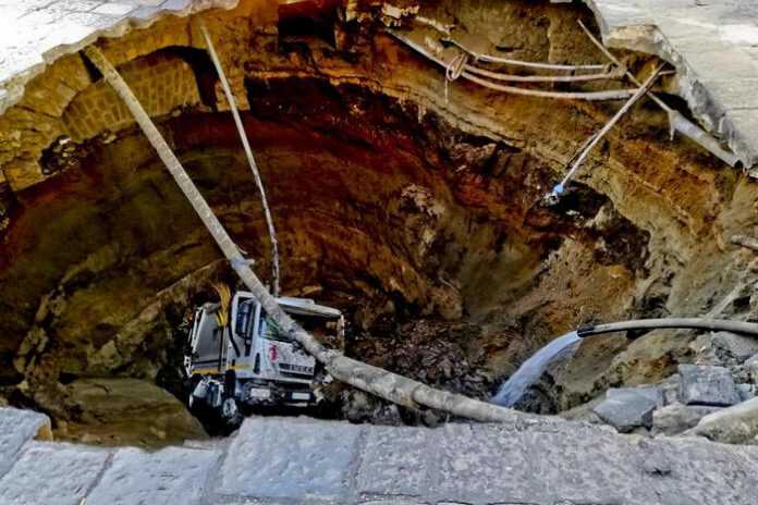 Casoria, si apre una voragine, precipita un compattatore, sette palazzi sgomberati