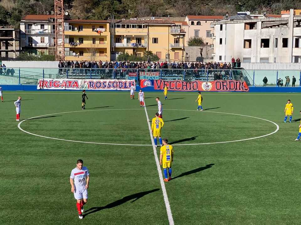 Ferullo deve fare i conti con tante assenze: sempre out Guerrera e Infante, si aggiungono De Angelis e Vissicchio, squalificati. Difesa composta da De Martino e Iommazzo sulle fasce con Mansi e Vallefuoco centrali. Senatore torna nei tre di centrocampo, insieme a Catalano e capitan Lettieri. In attacco si punta sul trio Ferrara- Apicella-Guillari. Castel San Giorgio, attendendo il rientro di D’Attilio tra qualche settimana, col 4-3-3 standard di questa fase di campionato, cioè con il 2002 Liguori centravanti, affiancato ai lati da Barbarisi e dal Liguori grande, e Cuomo adattato a terzino sinistro, con Capuano a destra ed al centro il tandem Catalano-Giura. In mezzo al campo l’esperienza che si chiama Ferrara, Vaccaro e Natiello. Strafalcione di Napoli, che per poco non regala la conclusione vincente a Liguori baby. E’ la partita tra le senza-centravanti, Iommazzo deve guardare sulla fascia l’esterno-goleador Barbarisi mentre sul fronte opposto massima attenzione per Lettieri, che causa assenze torna ad un raggio d’azione familiare a lui fino all’anno scorso. Centravanti o meno, all’11’ passano gli ospiti, lo fanno con Guillari, che sfrutta un’imbucata super di Francesco Catalano e batte Coppola. 16′, Liguori cerca a trova la conclusione di Barbarisi, che prende il palo, sulla ribattuta spreca tutto Cuomo, in condizione solitaria assoluta. Altra chance grandiosa, al 22′ Giura manda alle ortiche l’occasionissina. Al 24′ fa quel che vuole Barbarisi, cross per il centravanti Liguori, si salva di piede Napoli. Perde la testa Guillari al 27′. rosso diretto per scorrettezza a gioco fermo su Capuano. 41′, ci prova Ferrara, alto di poco. Erroraccio di Vaccaro, gli ruba palla Letteri, conclusione bassa non molto lontana dal palo alla destra di Coppola. Passano i minuti, per i sangiorgesi risulta complicato scavalcare due torri massicce come Vallefuoco e Mansi. Giallo per Senatore, punizione centrale, alta la mira di Natiello. Un minuto dopo, blocca facile Napoli sulla girata pretenziosa di Liguori l’esterno. Doppio cambio quando si riparte, Ferrentino e Somma per Natiello e Cristian Liguori. Spazi chiusi alla grande della squadra di Ferullo, che non sembra risentire dell’uomo in meno. Citro al posto di Liguori, va a fare la prima punta Barbarisi. Altro errore di Napoli, un banale fallo da rigore su Barbarisi, becca il giallo Napoli mentre tra arbitro Pistolesi e secondo assistente Pellecchia c’è lungo conciliabolo per possibile fuorigioco. Dal dischetto, fa centro Barbarisi al 16′. Capitan Ferrara, acciaccato, lascia il posto a Polichetti. Perdita notevole, visto che Ferrara era di gran lunga il centrocampista più ispirato di giornata. Ammonito Ferrentino. Escono De Martino e Senatore, dentro Asciuti e Bovino, accade dopo che Capuano svirgola di sinistro un’occasione nata dagli sviluppi del corner mancino di Ferrentino. Senza più geometrie, la squadra di De Cesare va con gli uno contro uno o con le palle lunghe. Altro rigore al 36′, mani di Vallefuoco. Dal dischetto fa una figuraccia Ferrentino, s’assume una responsabilità che andava lasciata ad altri disposti certamente a prendersela, tiro debole, respinto da Napoli, che sull’angolo successivo dice di no anche a Vaccaro. Si perde tempo, espulso De Cesare. Criscuoli dà il cambio ad Apicella, Esposito fa altrettanto con Cuomo. Altro intervento decisivo di Napoli quando s’entra nel recupero. Finisce pari, il Castel San Giorgio, che paradossalmente ha giocato meglio 11 contro 11, stecca la prova che poteva condurlo a credere in obiettivi massimi.