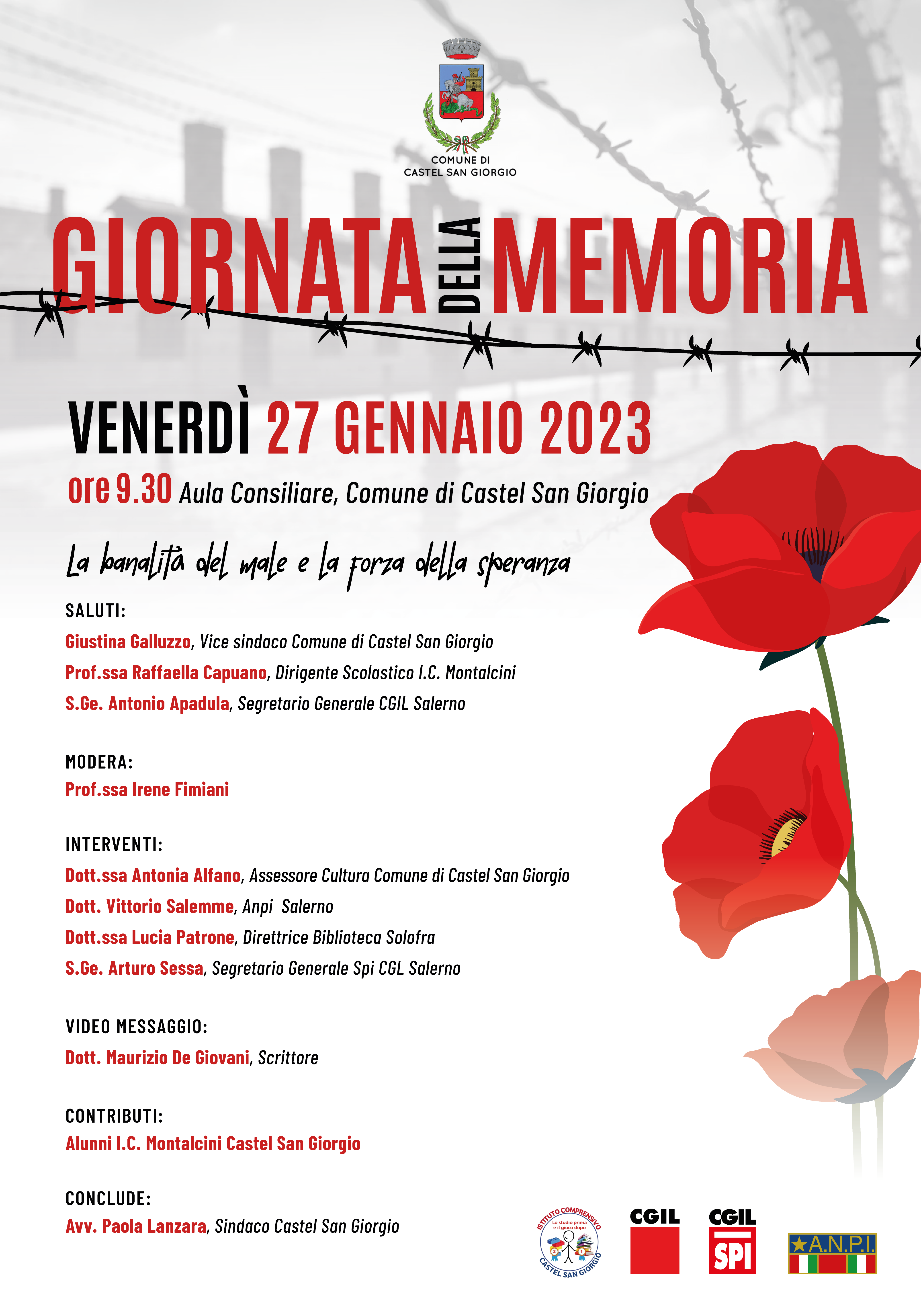 Le conclusioni saranno del sindaco di Castel San Giorgio Paola Lanzara. «L’Olocausto, che provocò l’uccisione di un terzo del popolo ebraico e di innumerevoli membri di altre minoranze, sarà per sempre un monito per tutti i popoli sui pericoli causati dall’odio, dal fanatismo, dal razzismo e dal pregiudizio-ha aggiunto ancora il primo cittadino nel presentare l’iniziativa di venerdì mattina-abbiamo tutti il dovere di ricordare questa pagina terribile, e lo facciamo in un giorno che ci riporta indietro nel tempo, fino a quel 27 gennaio del 1945, giorno in cui le truppe dell’Armata Rossa liberarono il campo di concentramento di Auschwitz sancendo la fine dell’Olocausto ma anche mostrando al mondo intero l’orrore. Rabbrividiamo ancora  dinanzi a quello scenario crudele e drammatico, ma ciò che purtroppo deve farci riflettere è che ancora oggi assistiamo, in varie parti del Mondo, ad un’escalation  del male, al risorgere di nuovi venti, inconsapevoli del passato, dell’intolleranza, dell’odio e della discriminazione che portarono ad una delle tragedie più grandi della Storia.