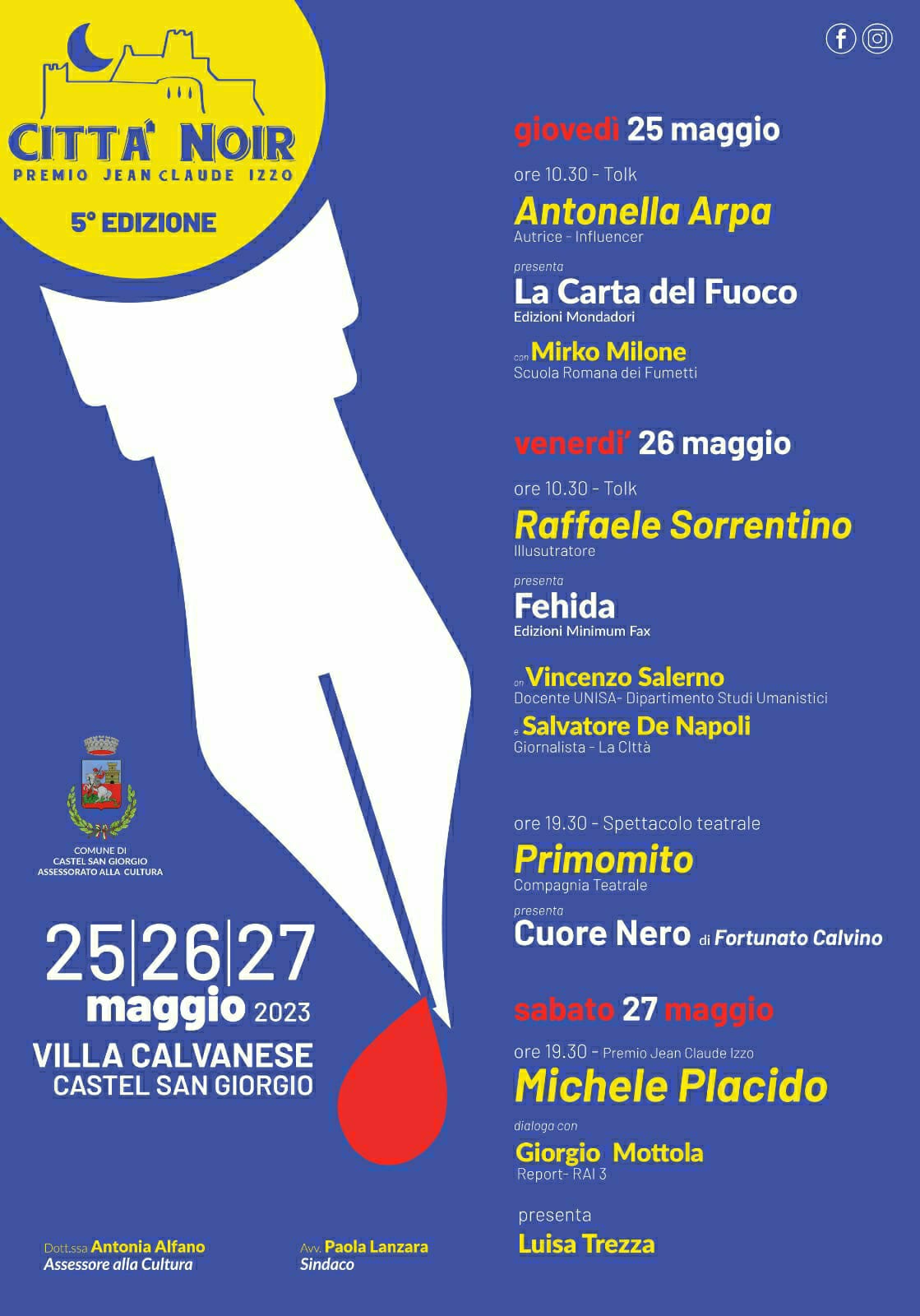 “Città Noir – Premio Jean Claude Izzo” scrittore, poeta, giornalista, drammaturgo e sceneggiatore marsigliese, padre del cosiddetto “noir mediterraneo”, nasce proprio per celebrare il legame tra Castel San Giorgio ed Izzo. Il padre, Gennaro, era di Torello. Anni fa il figlio di Jean Claude Izzo tornò a Castel San Giorgio per scoprire i luoghi natii. Il festival dedicato alla cultura, alla letteratura, al cinema ed al fumetto noir, è giunto quest’anno alla sua quinta edizione. Il premio Jean Claude Izzo sarà consegnato all’attore e regista Michele Placido che sarà a Villa Calvanese sabato 27 maggio alle ore 19.30.