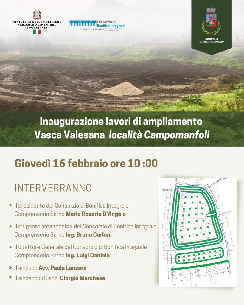 “È un’opera che contribuirà in maniera determinante alla messa in sicurezza del nostro territorio, un grazie all’intera struttura tecnica del  Consorzio e al presidente Rosario D’Angelo con cui, in questi anni, abbiamo lavorato in sinergia per arrivare a questo importante risultato. La vasca Valesana di Campomanfoli , oltre ad  un’opera idraulica di fondamentale importanza  per Castel San Giorgio ed i comuni a valle, sarà anche un parco urbano, un polmone verde attrezzato con area  giochi e pista ciclabile, dotato di telecamere di videosorveglianza ed illuminazione con pannelli fotovoltaici. Un’altra grande opera che consegneremo presto alla cittadinanza”-ha detto il sindaco Paola Lanzara.