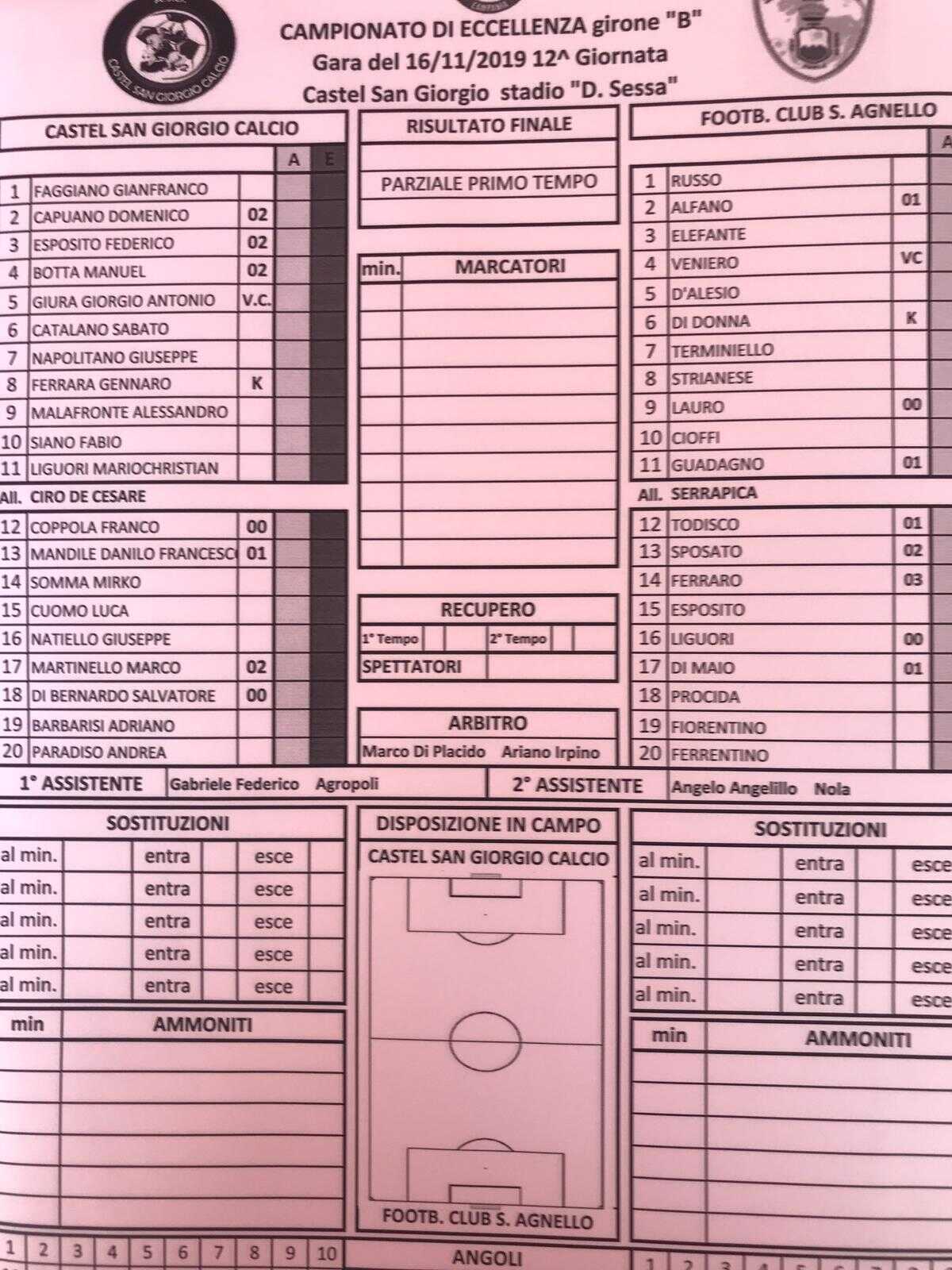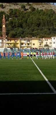 Finisce 1-1, rossoblù di casa frenati nella corsa verso la prima piazza. Al 3′ Terminiello chiama al paratone Faggiano, si capisce subito che il Sant’Agnello di Serrapica non starà a guardare, anzi… Al 12′ termina alto il destro di Liguori. Decisivo però Faggiano in due o tre circostanze, ritrovatosi ad intervenire una volta in sequenza doppia di interventi e con singolo parata in un’altra, a testimonianza del forcing iniziale degli ospiti. La reazione arriva, palo di Malafronte, grande chance sprecata da Liguori. A inizio ripresa Malafronte ancora vicinissimo al gol,reattivo Russo nella circostanza. De Cesare corre ai ripari, con cambi che cercano di mutare l’inerzia del pomeriggio. Entra Barbarisi, subito pericoloso, con destro a giro, per poi andare al gol al 72′, chiudendo in bello stile l’azione nata dal solito affondo decisivo di Liguori, che mette il numero 19 di casa in condizione di colpire da cecchino sul secondo palo, incrociando alla perfezione col destro. Gol meritato ma non decisivo. A sei minuti dalla fine, l’ex Ferrentino trova Strianese con perfetto inserimento sul primo palo, insomma è gol del pari abbastanza beffardo. Nel finale i sangiorgesi trovano la forza per crederci ancora ma la conclusione di Botta si avvicina alla traversa senza centrare il bersaglio.