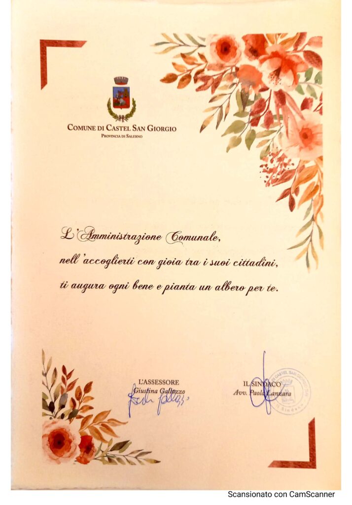 «Un plauso va anche al nostro ufficio, ai Servizi Demografici del Comune di Castel San Giorgio che ogni mese ci forniscono il numero dei neonati che vengono registrati all’ufficio anagrafe. Appena ricevuta la comunicazione ufficiale delle nuove nascite, a casa dei neonati facciamo recapitare subito una bella pergamena con cui accogliamo ufficialmente nella nostra comunità il nuovo componente, ai piccoli auguriamo ogni bene e comunichiamo che, in occasione della loro nascita, sarà piantato un albero. Infatti, ogni fine mese, con l’assessore Galluzzo, procediamo alla piantumazione delle piantine»-ha concluso Paola Lanzara.