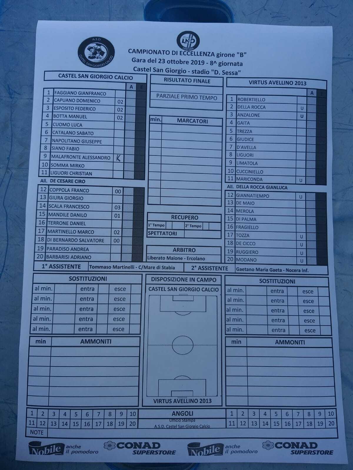 CASTEL SAN GIORGIO (4-3-3): Faggiano; Capuano (80′ Mandile), Catalano, Cuomo, Esposito; Siano (70′ Paradiso), Botta. Somma; Napolitano (53′ Barbarisi), Malafronte, Liguori. All.: De Cesare