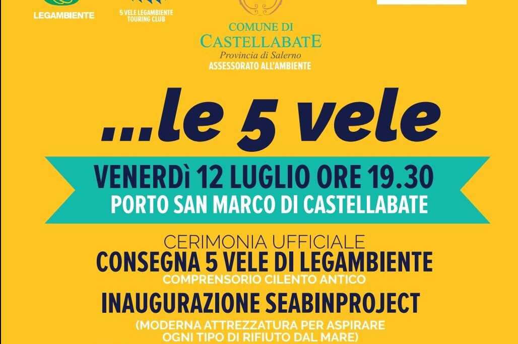 Venerdì 12 luglio alle ore 19:30 nell’area portuale di San Marco, una cerimonia verrà dedicata al vessillo con la consegna ufficiale delle Cinque Vele da parte del Presidente Legambiente Campania Maria Teresa Imparato al Comune di Castellabate, alla presenza del Sottosegretario al Ministero dell’ambiente e della tutela del territorio e del mare, l’on. Salvatore Micillo, del Sindaco di Castellabate Costabile Spinelli, dell’Assessore all’Ambiente Domenico Di Luccia e di autorità civili e militari.