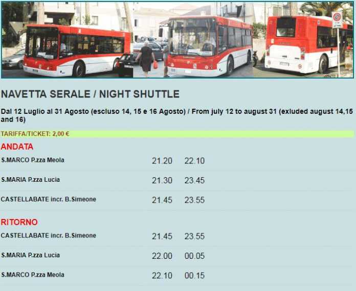 La navetta permetterà di evitare l’utilizzo di mezzi propri e la ricerca di un parcheggio nel centro antico. Il servizio è stato promosso dal Comune di Castellabate ed è a cura dalla società di trasporti locale SMEC. Due le corse effettuate: la prima con partenza da Piazza Meola a San Marco alle 21:20, fermata in Piazza Lucia a Santa Maria alle 21:30 e arrivo a Castellabate, presso l’incrocio Beato Simeone previsto per le 21:45. Il secondo viaggio prevede la partenza da San Marco alle 22:10, una tappa a S. Maria alle 23:45 e l’arrivo nel centro storico alle 23:55. Per il rientro da Castellabate, incrocio Beato Simeone, la prima partenza è prevista alle 21:45 e la seconda alle 23:55. Il servizio rimarrà attivo, ad esclusione del 14, 15 e 16 agosto, tutte le sere fino al 31 agosto.